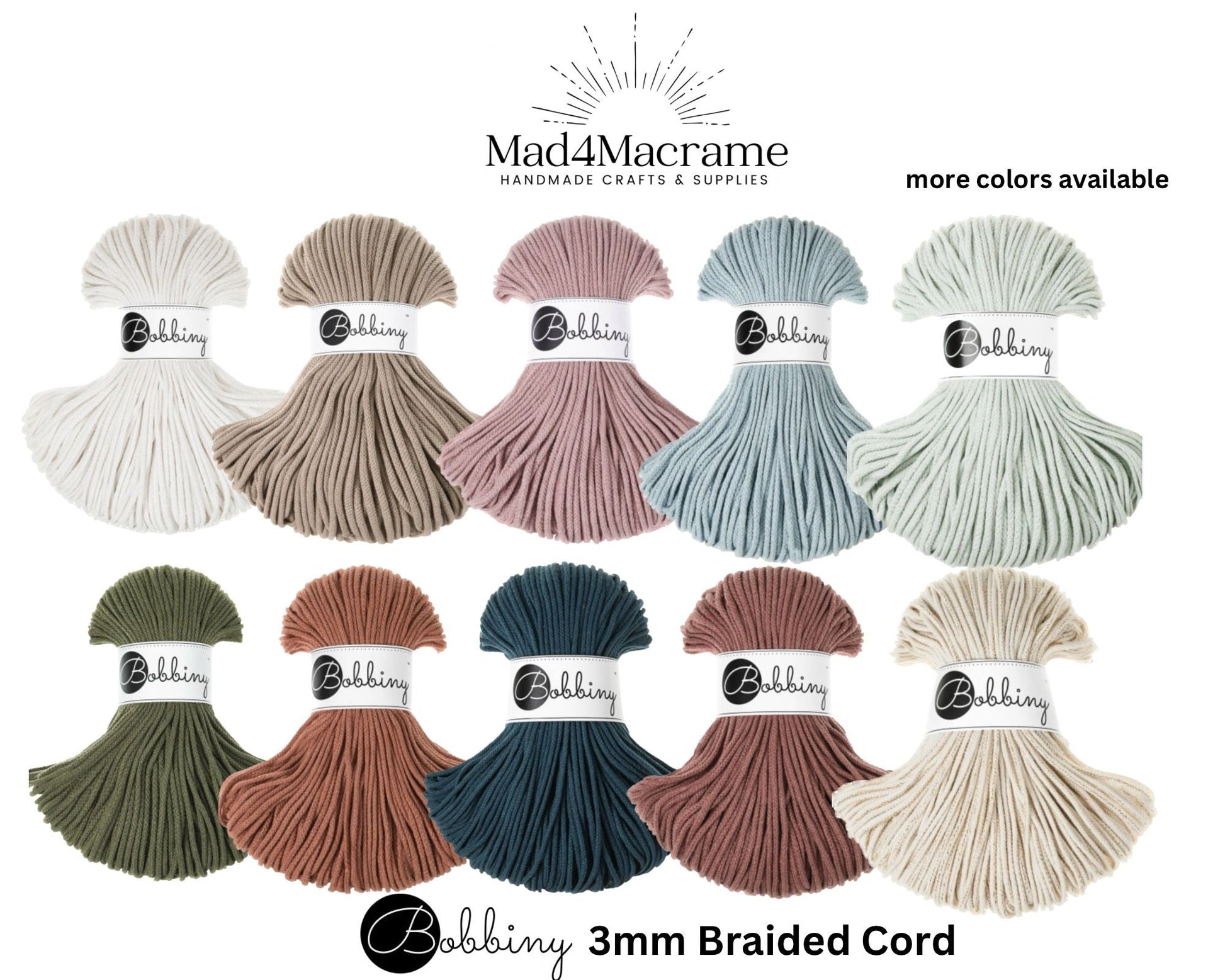 Bobbiny 3mm Braided This cotton cord is soft, flexible and durable. The cord is perfect for macrame projects, crochet, knit rugs, baskets, coasters, place mats, jewelry, drawstring bags and craft projects.