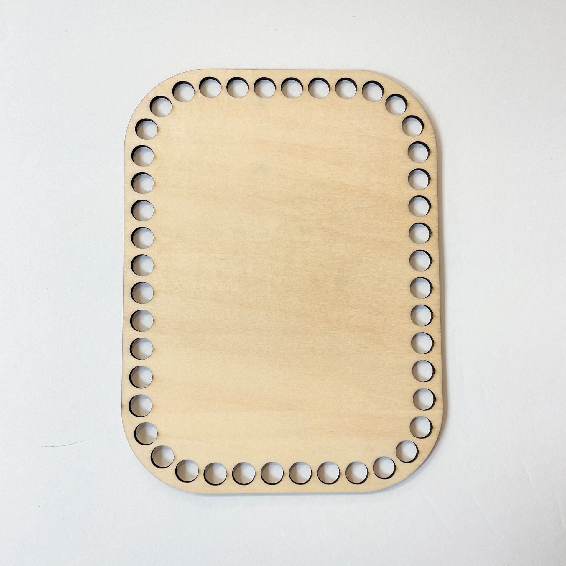 Rounded Rectangular Wooden Base-8x6 inches (10mm holes) Craft with ease using our handmade wooden crochet bases! This unique shape measures 8x 6 inches with perfectly sized 10mm holes, these bases are tailor-made for using Bobbiny’s braided cord. Crafted from high-quality wood, they offer durability and stability for your designs. Also, the bases can be stained or painted to your liking. Elevate your crochet game with these essential bases today! The bases are plain without a logo. If you’re interested in a custom base with your logo or name, please send me a message. elizabeth@mad4macrame.com