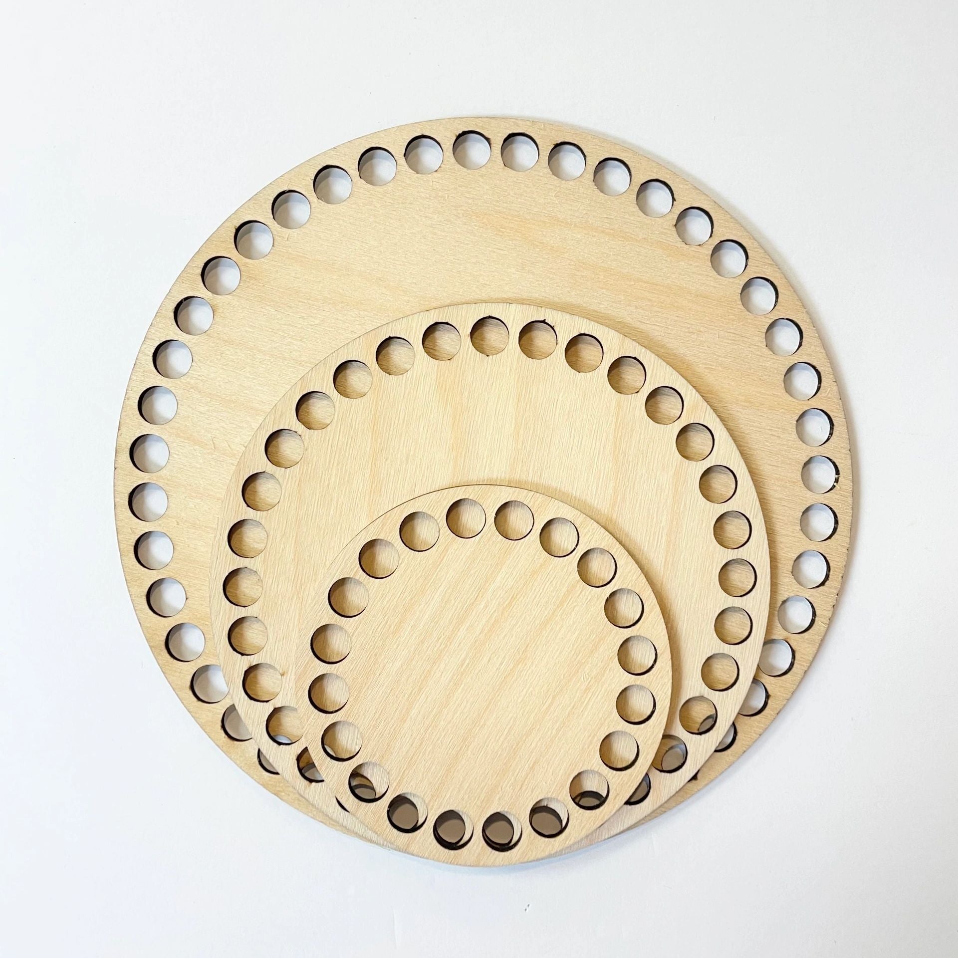 Wooden Bases Set-4, 6, 8 inches (10mm holes) Craft with ease using our handmade wooden crochet bases! Measuring 4, 6, and 8 inches in diameter with perfectly sized 10mm holes, these bases are tailor-made for using Bobbiny’s braided cord. Crafted from high-quality wood, they offer durability and stability for your designs. Also, the bases can be stained or painted to your liking. Elevate your crochet game with these essential bases today!