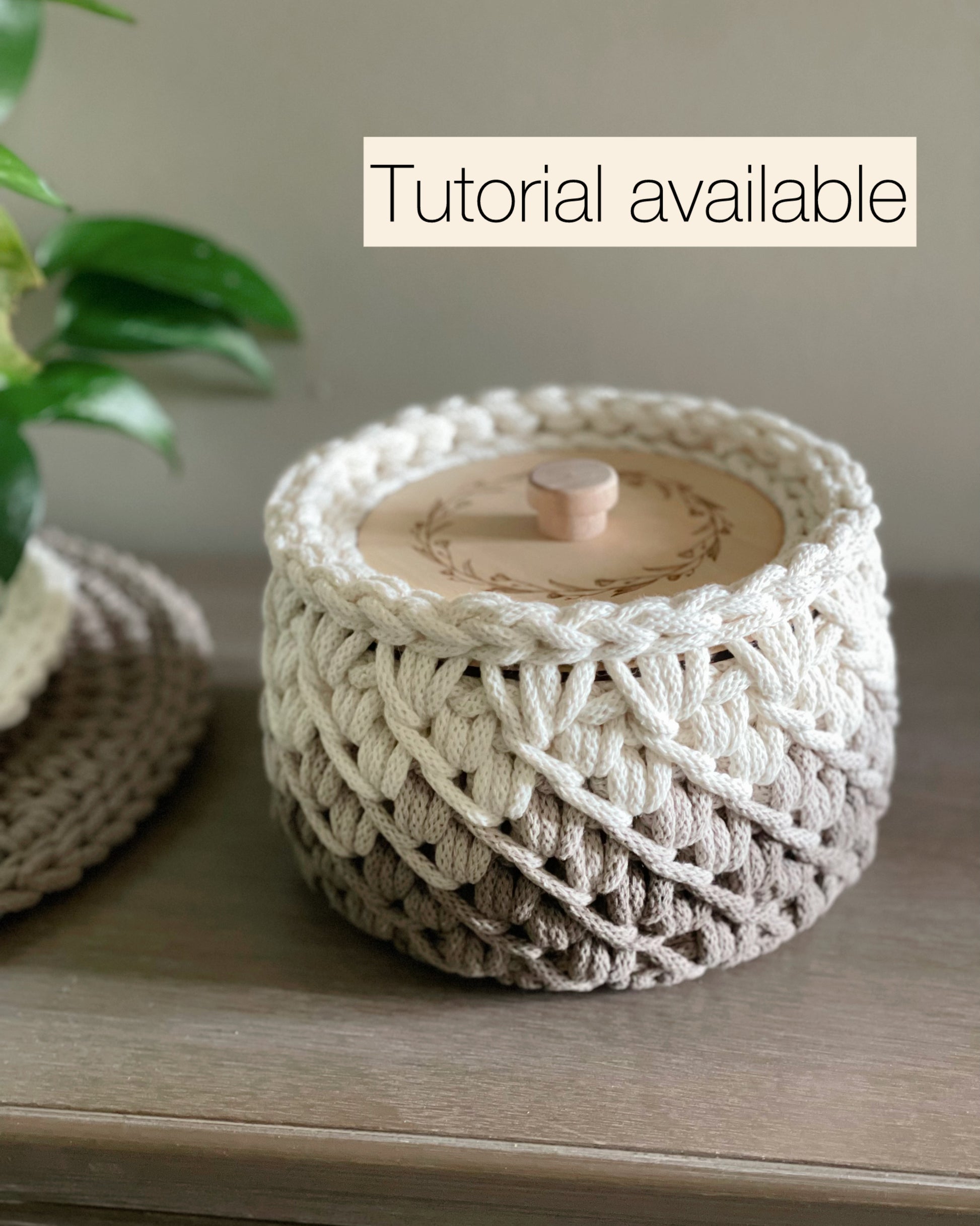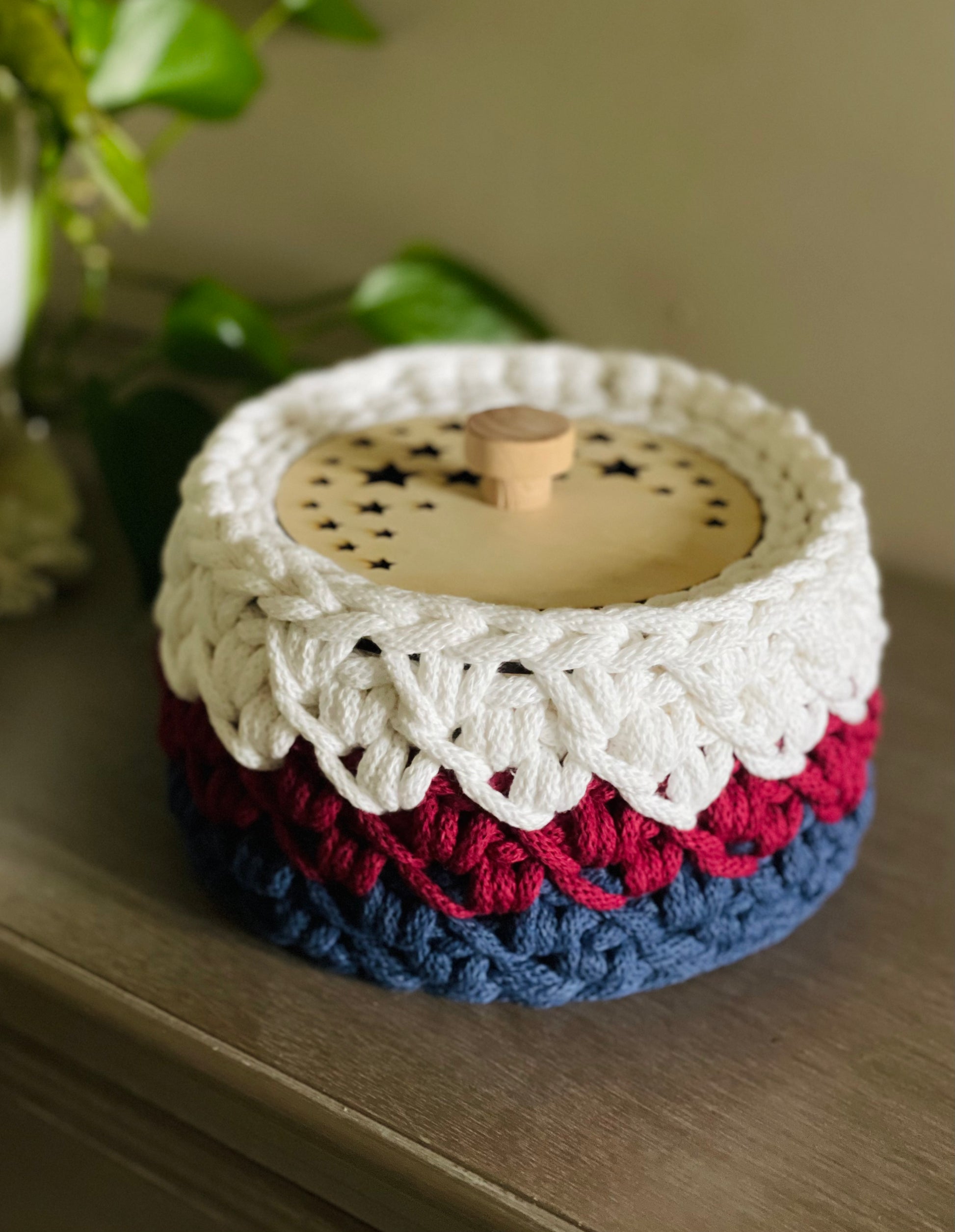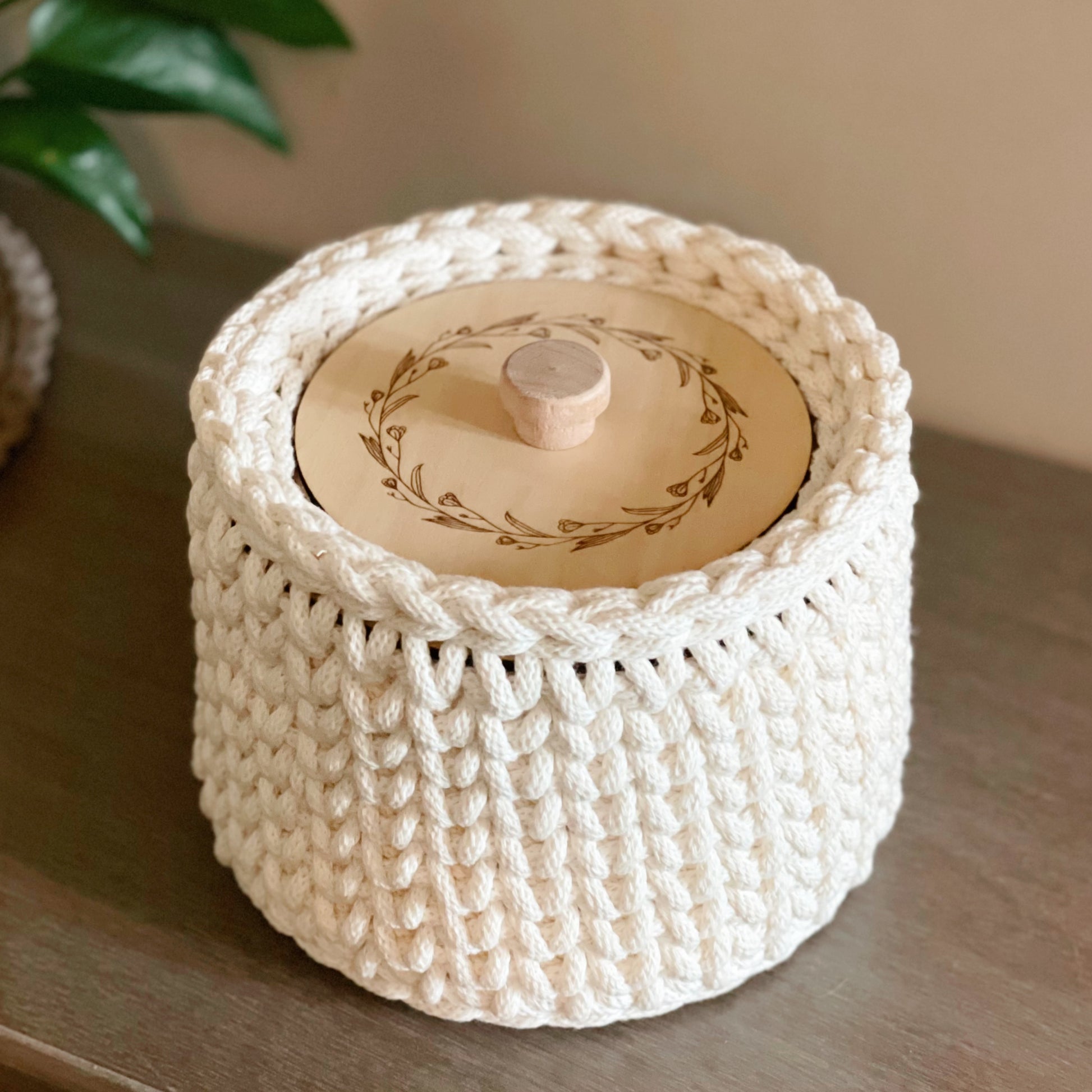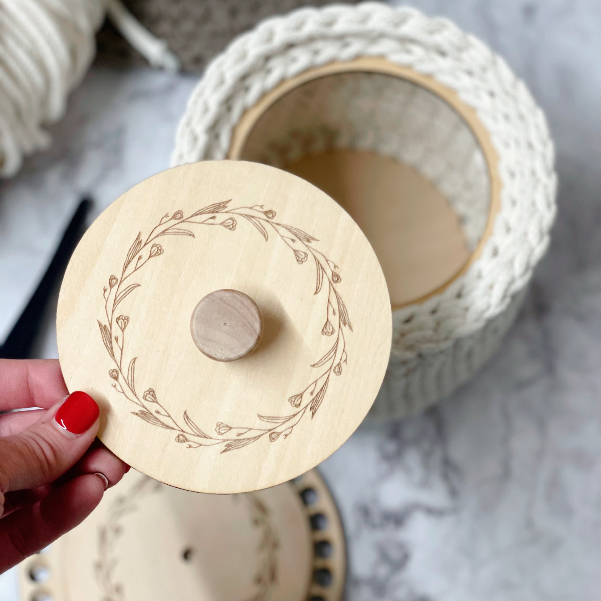 All pieces are laser cut from 3 mm unfinished basswood, ready to be painted, stained, or left natural to match your style. The top ring ensures the lid fits snugly and won’t slip off after crocheting a slip stitch around the top ring– a true lidded basket solution!