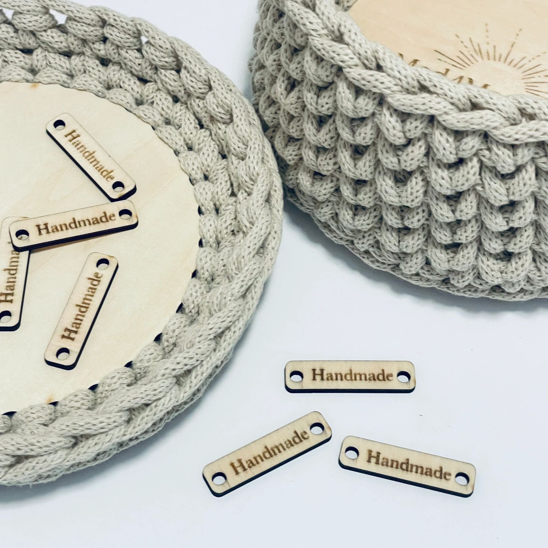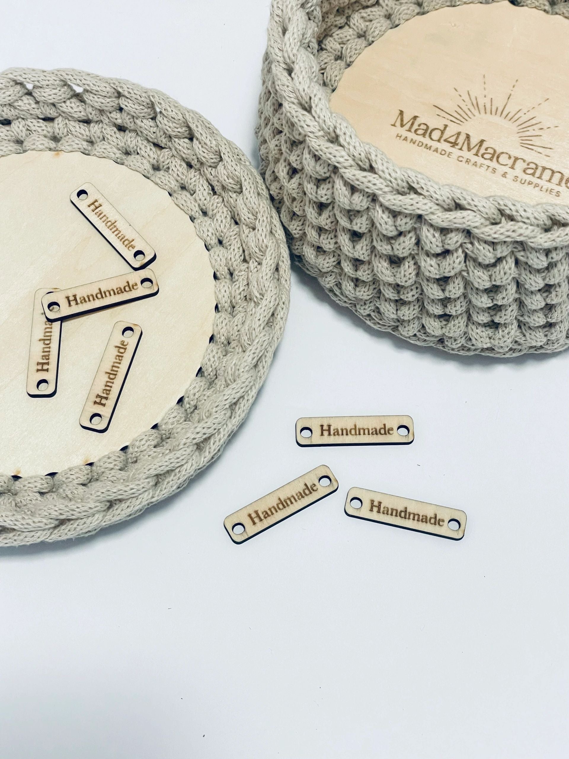 Wooden Handmade Tags Add a special touch to your handmade pieces with these wooden tags. These tags are a great addition to baskets and wall hangings. Our premade wooden tags are 0.4 inches wide by 1.6 inches long with a traditional font that says “Handmade.” They are available in packs of 5, 10 or 20. Each tag is laser cut from 3mm thick basswood.